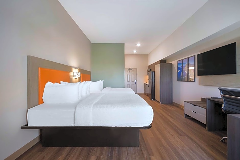 Indulge in our spacious, non-smoking Queen Suite with Two Queen Beds, perfect for families or groups of friends. With its well-equipped kitchen, private bathroom, and comfortable amenities like a flat-screen TV, air conditioning, and free toiletries, you'll have everything you need for a relaxing and convenient stay. Accommodating up to 4 adults and 3 children, this suite offers the perfect blend of comfort and functionality.
